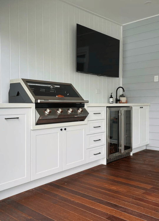 Our DIY project has successfully upgraded the outdoor BBQ area, incorporating Lexicon shaker doors and a sturdy 40mm Caesarstone benchtop. This personal touch adds character and durability, making it a focal point for home gatherings.