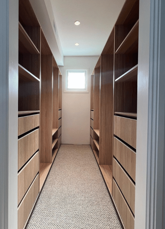 The latest installation in our Caringbah job brings to life the dream of a walk-in robe, using Polytec Natural Oak for a warm, inviting feel. The design smartly balances chic aesthetics with functional storage solutions.